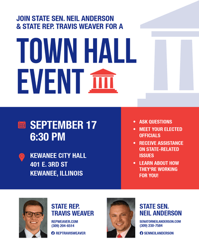State Representative Travis Weaver and State Senator Neil Anderson are set to hold a Town Hall event next Wednesday, September 17, 2025, at Kewanee City Hall. The event begins at 6:30 PM and provides residents with an opportunity to ...
