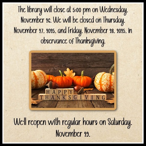 The Kewanee Public Library has announced changes to its operating hours for Thanksgiving week. On Wednesday, November 26th, the library will close early at 5 PM. It will remain closed for the holiday on Thursday, the 27th, and Friday, ...