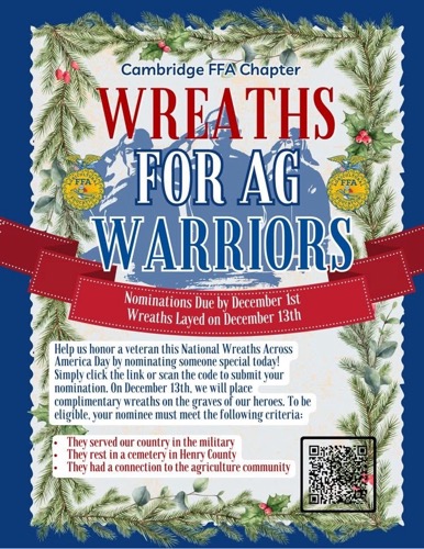 The Cambridge FFA Chapter is now seeking nominations to recognize veterans as part of National Wreaths Across America Day. To be eligible, veterans must have served in the military, be buried in Henry County, and share a connection to ...
