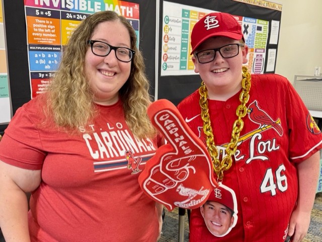 Mrs. Laird and Levi are representing the St. Louis Cardinals for spirit week at MMS! #MAC185 #MacombMiddleSchool #supercardinalfans