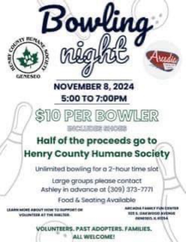 On November 8, 2024, Geneseo will host a charity bowling event at Arcadia from 5 PM to 7 PM. Each participant pays $10, with half the proceeds benefiting the Geneseo Henry County Humane Society. The event offers unlimited bowling ...