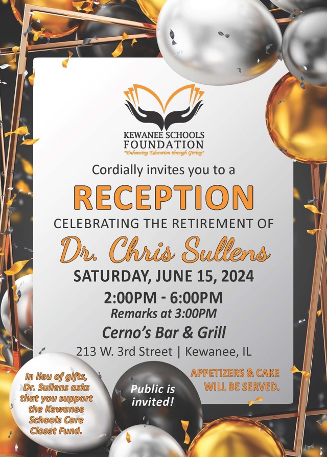 The Kewanee Schools Foundation is holding a reception for Dr. Chris Sullens on Saturday, June 15, 2024, from 2 to 6 PM, at Cerno's Bar and Grill. The public is invited to come celebrate Dr. Chris Sullens and his ...