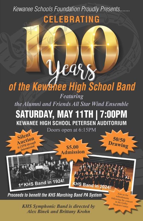 In a harmonious blend of tradition and celebration, the Kewanee Schools Foundation has announced a special concert to celebrate the centennial of the Kewanee High School Band. Slated for May 11, 2024, this musical extravaganza will feature the All-Star Wind Ensemble, showcasing a century of musical excellence. The concert will take place in Petersen Auditorium at 7 PM. The goal of the event is to raise $7,000 for a PA system for the KHS Music Department, which will enhance the performances of the marching band and concert band at events and competitions. Tickets are available for just $5, offering an affordable way to support and enjoy the rich musical heritage of Kewanee High School. There will be a silent auction in the Petersen Auditorium lobby before the concert and at intermission, as well as a 50/50 drawing. Refreshments will be provided after the concert. Doors open at 6:15 pm.