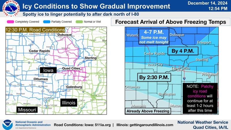 [12:55 P.M. Saturday, December 14, 2024]According to the NWS of the Quad Cities, “A look at road conditions as reported by DOTs show partially to completely ice covered in most locations, but a slow improving trend from south to north. That improvement is tied to temperatures warming, and shown is the forecast arrival time of above freezing temperatures. Note there will be residual patchy icy roads lasting beyond that time.”
