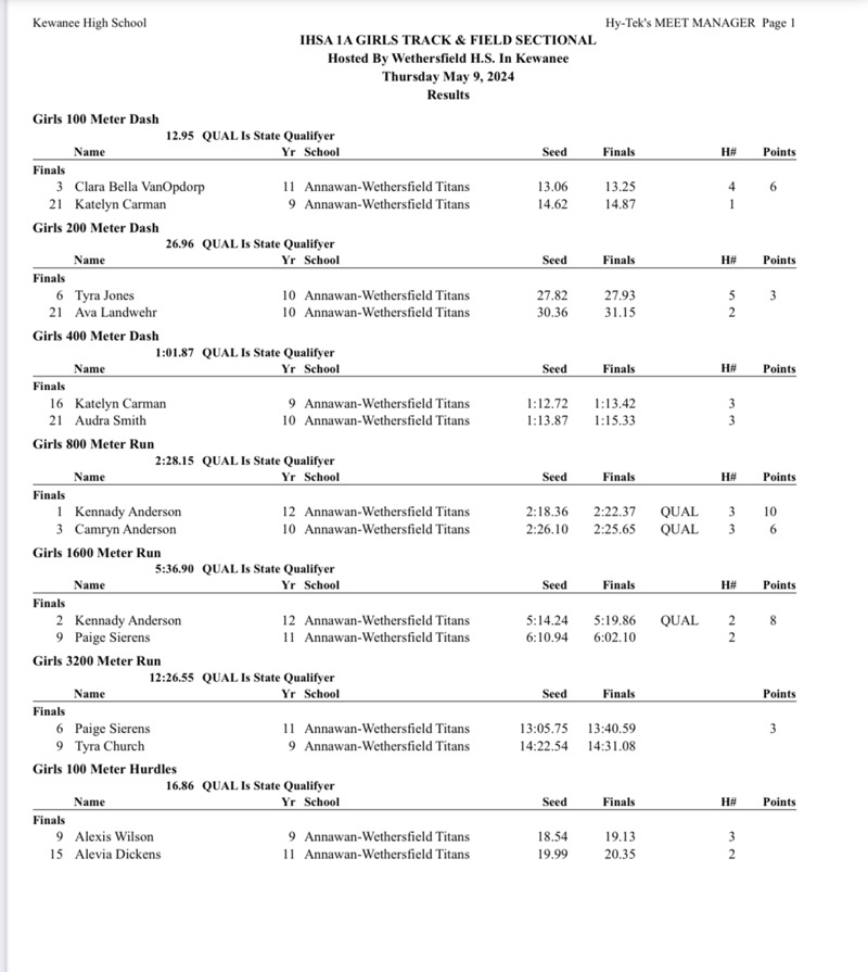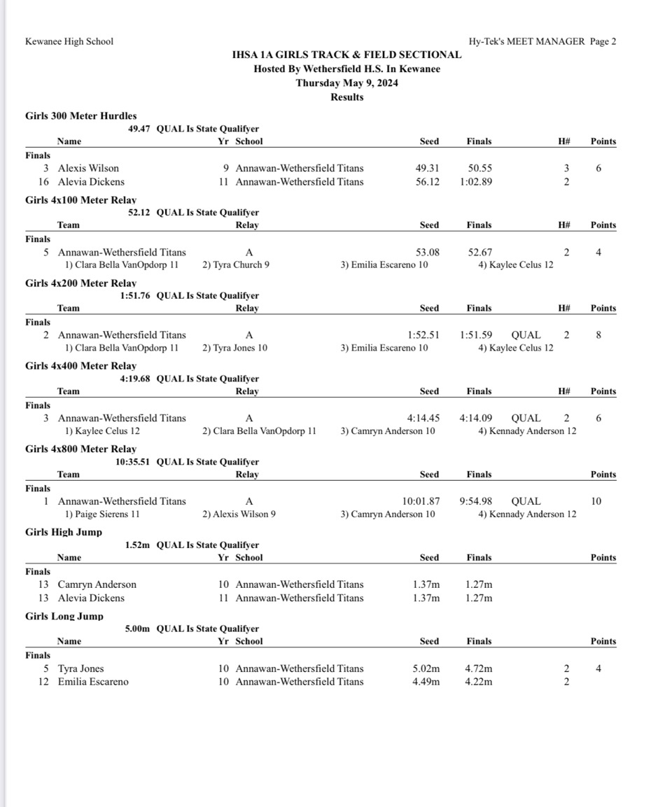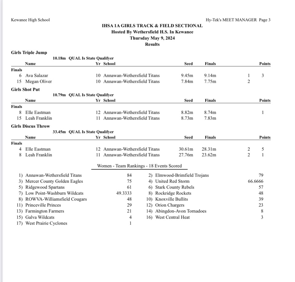 The A/W Lady Titans track & field team didn’t let the cold stop them from taking the top spot last night and secured the Sectional title. Annawan-Wethersfield hosted the IHSA Class 1A Sectionals on May 9, 2023.