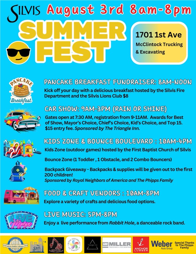 Don’t miss out on all the fun in Silvis on Saturday, August 3, 2024, during Silvis Summer Fest from 8 AM to 8 PM. The morning starts with a pancake breakfast fundraiser from 8 AM to noon hosted by the Silvis Fire Department and the Silvis Lions Club for $8. The car show will happen, rain or shine, from 9 AM to 3 PM, gates open at 7:30 AM, and registration is from 9 to 11 AM. There will be awards for Best of Show, Mayor’s Choice, Chief’s Choice, Kid’s Choice, and Top 15. The registration cost is $15. Admission is free and sponsored by The Triangle Inn. A kid’s zone is open from 10 AM to 4 PM and includes outdoor games hosted by the First Baptist Church of Silvis, a bounce zone with bounce houses, and a backpack giveaway with school supplies given to the first 200 children. Food and craft vendors will be onsite from 10 AM to 8 PM. Rabbit Hole will provide danceable rock-in-roll music to end the night from 5 to 8 PM.
