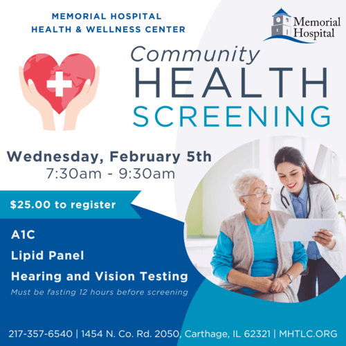 On February 5, 2025, Memorial Hospital in Carthage, Illinois, will host community health screenings, including A1C, lipid panel, hearing, and vision tests, for $25. This initiative aims to reduce the impact of heart disease, the leading cause of death in adults in the United States. Registration is required in advance, with limited spots available.