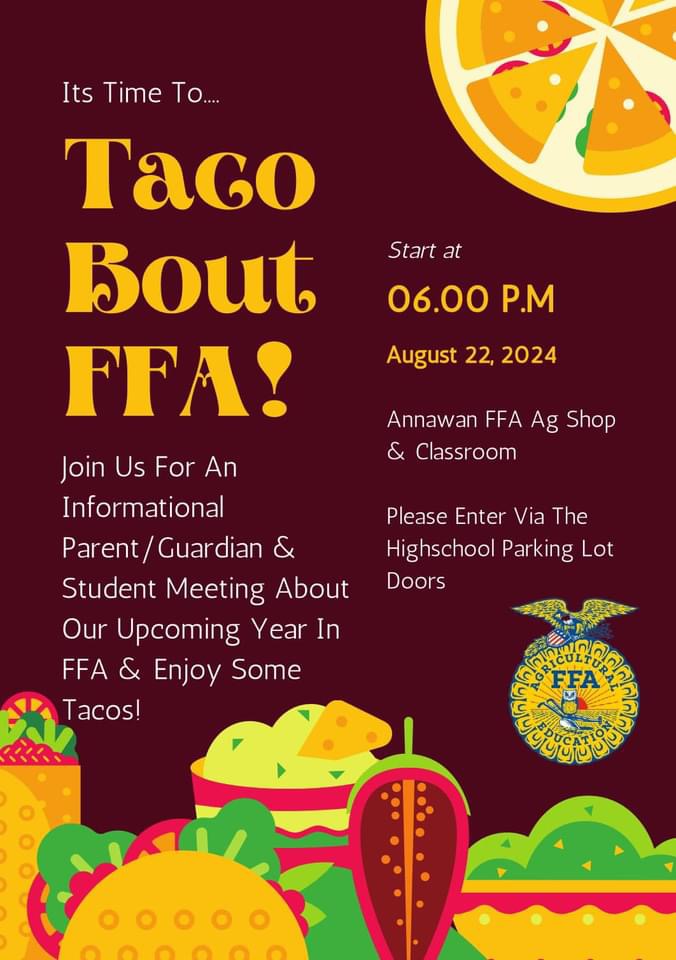 The Annawan Agricultural Development and FFA Chapter are holding an informational meeting tonight, August 22, 2024, for parents and students for the upcoming FFA year. Join the Annawan FFA Chapter to “Taco Bout FFA” in the Ag shop and classroom at 6 PM, and enjoy some tacos.