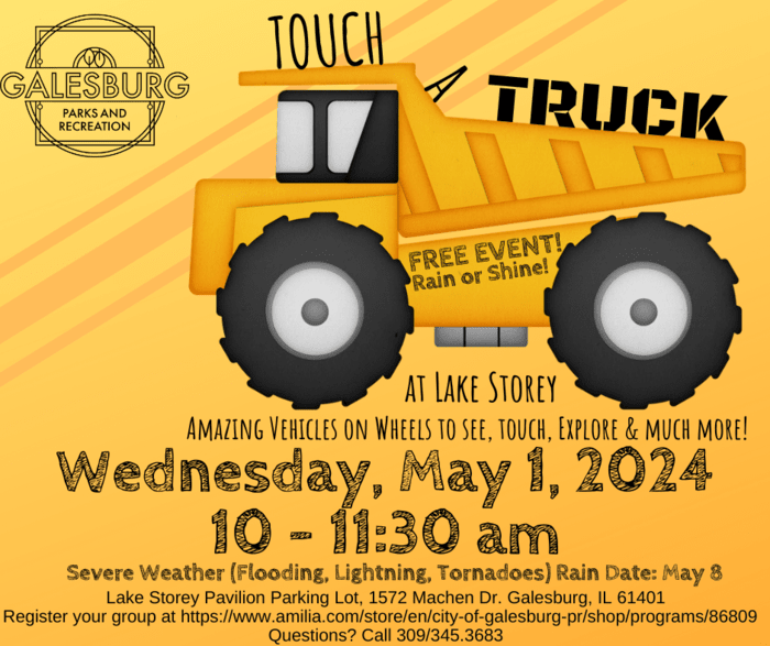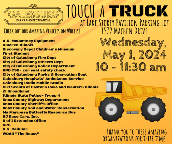 The City of Galesburg is gearing up for an engaging experience for children with its annual Touch a Truck event. Set for May 1, 2024, at the scenic Lake Storey Pavilion, the event promises a morning filled with exploration and fun, running from 10:00 to 11:30 AM. This unique gathering offers kids the chance to get up close with a range of impressive vehicles, such as fire trucks, police cars, and even a race car. The event isn’t just about exploration; it also focuses on safety, with car seat checks available, along with a mobile playground to enhance the family-friendly atmosphere. This free event is a perfect way to educate and entertain, fostering a better understanding of the vehicles that serve our community.