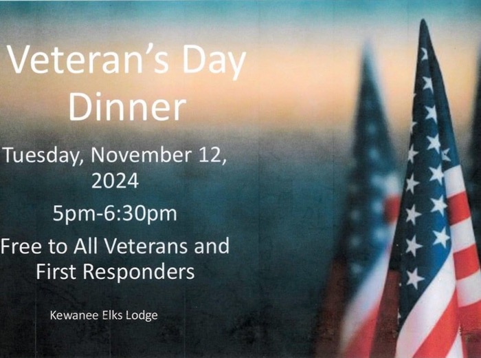 In honor of Veterans Day, the Kewanee Elks Lodge will host a free dinner for all veterans and first responders on Tuesday, November 12, 2024, from 5 pm to 6:30 pm. This event recognizes the contributions and sacrifices of those who have served.