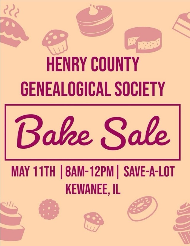 The Henry County Genealogical Society is having a bake sale on Saturday, May 11, 2024, from 8 AM to 12 PM, at Sav-a-lot in Kewanee, Illinois. Watch their Facebook page for monthly meeting information.