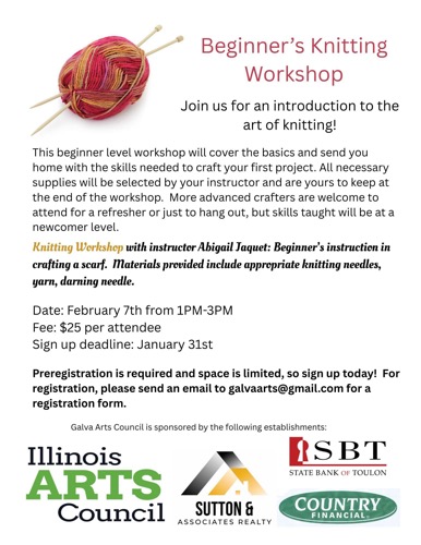 Beginner Knitting Workshop Offered by Galva Arts Council on February 7, 2026