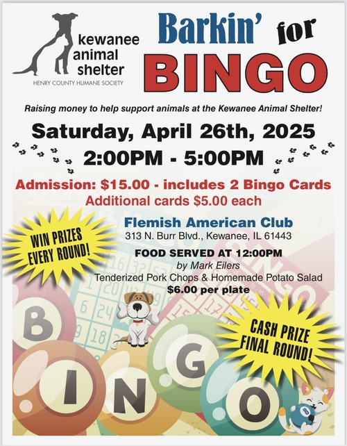 Kewanee residents are invited to support the local animal shelter at a special bingo fundraising event on Saturday, April 26, 2025, from 2 to 5 PM. The festivities take place at the Flemish American Club, with admission set at $15, granting each attendee two bingo cards. Additional cards can be purchased for $5 for extra chances to win. Lunch by Mark Eilers is served at noon for $6 a plate, which gets you a tenderized pork chop and potato salad. Throughout the event, prizes will be handed out every round, culminating in a cash prize for the lucky winner of the final game. All proceeds will benefit the Kewanee Animal Shelter, helping provide care and resources for animals in need. Organizers encourage participation to enjoy a night of fun while supporting a great cause.