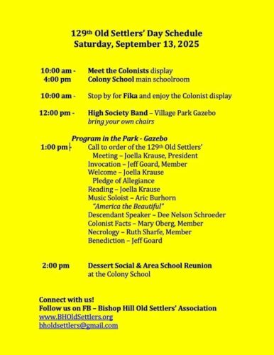 Bishop Hill will celebrate its 129th Old Settlers’ Day on Saturday, September 13, 2025. Festivities start with Morning Fika at 10 AM at the Colony School, featuring a “Meet the Colonists” display. At noon, the High Society Band takes the stage in Village Park—attendees are encouraged to bring their own chairs. The afternoon offers an Area School Reunion and Dessert Social at 2 PM, serving sweets and classic drinks like lingonberry iced tea. The celebration also honors 179 years since the founding of Bishop Hill. All events are free, with museums, shops, and local restaurants available throughout town.