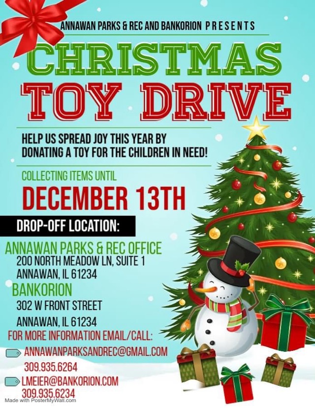 The Annawan Parks and Recreation Department, in partnership with BankOrion, is hosting a Christmas Toy Drive. They are collecting toys for children in need until December 13th. Drop-off locations include the Annawan Parks and Rec Office at 200 North Meadow Lane, Suite 1, and BankOrion at 302 West Front Street. For more details, contact the Annawan Parks office at [email protected] or call 309-935-6264, or BankOrion at [email protected] or call 309-935-6234.