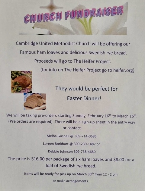Cambridge United Methodist Church is hosting a fundraiser featuring their famous ham loaves and Swedish rye bread. Proceeds will benefit the Heifer Project. Prices are $16 for ham loaves and $8 for rye bread. Pre-orders are required and can be placed from February 16th to March 16th. Pickup is scheduled for March 30th from 12 to 2 PM. For details, contact Melba Gosnell at 309-714-0686, Loreen Borkhart at 309-230-1487, or Debbie Johnson at 309-738-4680.