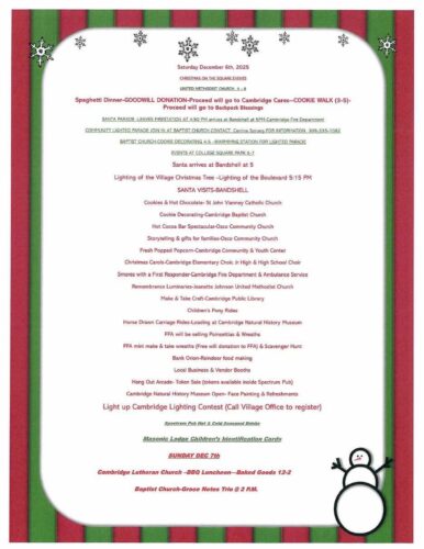 Cambridge is set to sparkle on December 6th as Christmas on the Square arrives, bringing festive cheer to the United Methodist Church, College Square Park, and local churches across town. Families can look forward to a variety of activities, including a spaghetti dinner for a goodwill donation to Cambridge Cares, a cookie walk for a goodwill donation to Backpack Blessings, a lively Santa parade, the annual tree lighting, and holiday crafts. Children will enjoy cookie decorating, rides, and a chance to join in the caroling. The celebration extends into Sunday, featuring a community BBQ luncheon and a special musical performance that promises to delight attendees and wrap up the weekend’s festivities on a joyful note.