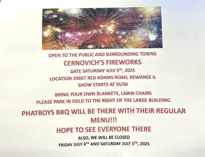 The celebration continues Saturday morning at the Kewanee Farmers Market, and don’t miss another dazzling fireworks show at Cernovich Salvage Saturday night.