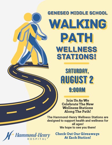 Community members are invited to gather on August 2nd at 9 AM for the ceremonial ribbon cutting of the new Hammond-Henry Wellness Stations along the Geneseo Middle School Walking Path. The celebration will feature giveaways at each station, all courtesy of Hammond-Henry Hospital. These stations have been installed to promote physical activity, mindfulness, and overall wellness for residents of all ages. Organizers encourage everyone to attend, explore the interactive stations, and participate in this new health initiative. Attendees will have the chance to try out each station and join others on a stroll along the updated trail, highlighting Geneseo’s commitment to community health and togetherness. Don’t miss this opportunity to walk toward better well-being.
