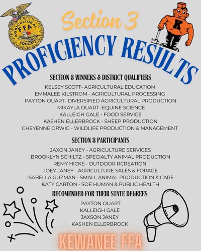 The results for the Section 3 FFA proficiency awards have been announced. Congratulations to section winners and district qualifiers: Kelsey Scott in Agricultural Education, Emmalee Kilstrom in Agricultural Processing, Payton Quart in Diversified Agricultural Production, Mikayla Ouart in Equine Science, Kalleigh Gale in Food Service, Kashen Ellerbrock in Sheep Production, and Cheyenne Orwig in Wildlife Production and Management.