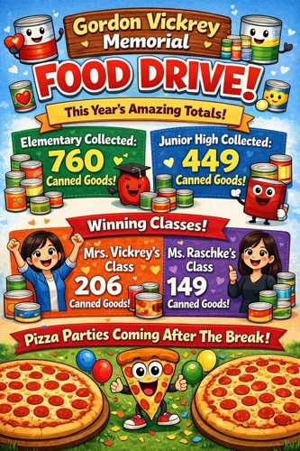 The Gordon Vickrey Memorial Food Drive wrapped up with an impressive total: the elementary school gathered 760 canned goods, while the junior high contributed 449. Mrs. Vickrey’s class stood out by collecting 206 cans, securing first place, followed by Ms. Raschke’s class with 149 cans.