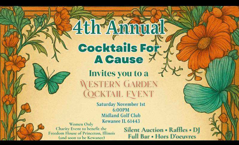 The fourth annual Cocktails For A Cause is set for Saturday, November 1st, at 6 PM, at Midland Golf Club in Kewanee. This exclusive women-only gathering is dedicated to supporting Freedom House of Princeton and the soon-to-be Kewanee shelter. Attendees can look forward to a vibrant evening featuring a silent auction, raffles, lively music from a DJ, a full bar, and hors d’oeuvres. Organizers hope the event will raise vital funds and awareness for Freedom House, which provides support to survivors of domestic and sexual violence. Local businesses and community members have contributed to the auction, promising a memorable event for an important cause.