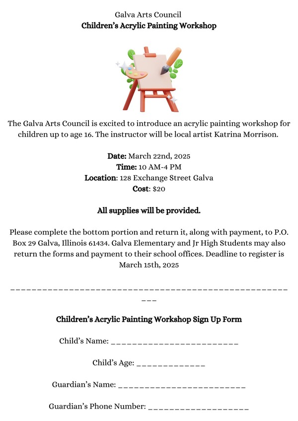The Galva Arts Council is thrilled to host an acrylic painting workshop tailored for young artists up to age 16. Celebrated local artist Katrina Morrison will lead the session. Set for March 22, 2025, from 10 AM to 4 PM at 128 Exchange Street, Galva, the workshop costs $20, covering all necessary supplies. Registration involves completing the form available in the discussion and submitting it, with payment, to P.O. Box 29, Galva, Illinois 61434. Students can alternatively submit these to their school’s office. Mark your calendars—the registration deadline is March 15th.