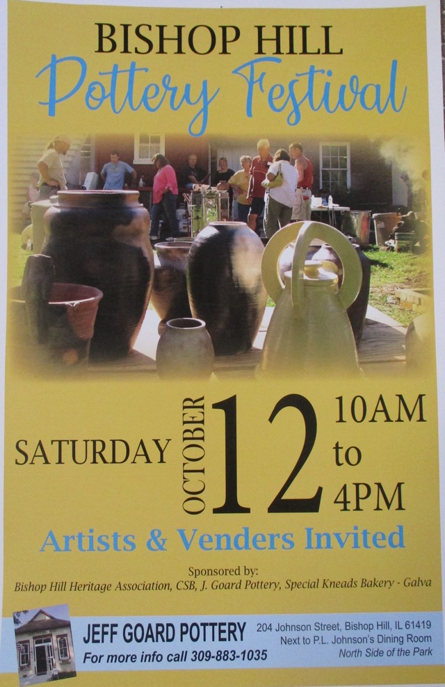 Bishop Hill is gearing up for its annual Pottery Festival, scheduled for October 12, 2024. From 10 AM to 4 PM, the north side of the village park will transform into a vibrant showcase featuring not just pottery but also basketry, stained glass, and jewelry. Attendees will have the opportunity to view live demonstrations, offering a behind-the-scenes look at the creative processes. Hosted next to J. Goard Pottery on Johnson Street, this event promises to be a cultural highlight. Come early to purchase tasty treats from the Special Needs Bakery tent.  The Bishop Hill Heritage Association, J. Goard Pottery, and Special Kneads Bakery are sponsoring this artisan affair, celebrating the community’s rich artistic tradition. For more information, call Jeff Goard at 309-883-1035.