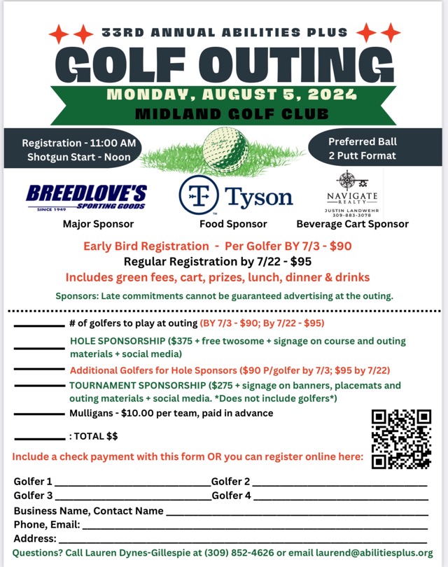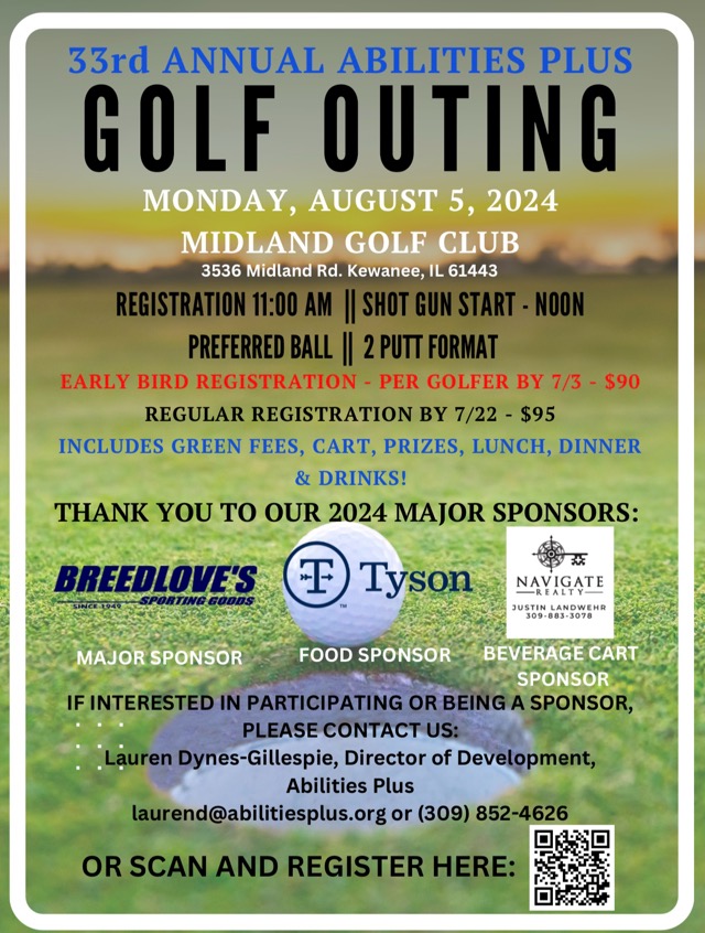 The 33rd Annual Abilities Plus Golf Outing is around the corner. Abilities Plus is seeking donations of merchandise or gift certificates. All donors will be featured in publications and be recognized at the golf outing and on social media leading to the event. The golf outing is on August 5, 2024, at Midland Golf Club. The golf outing helps provide financial assistance for Abilities Plus programs that serve children and adults with disabilities in Henry, Stark, and Western Bureau Counties. Contact Lauren Dynes-Gillespie at 309-852-4626 or [email protected] with any questions.