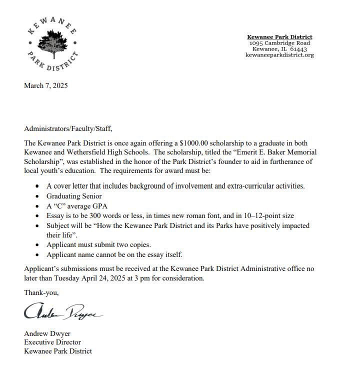 The Kewanee Park District is proud to announce the Emerit E. Baker Memorial Scholarship, an incredible opportunity for graduating seniors of Kewanee and Wethersfield High Schools. This $1,000 scholarship honors the founder’s legacy and the vital role local parks play in shaping future leaders. Applicants need to submit a cover letter, and essay, and meet GPA criteria by April 24, 2025, at the Kewanee Park District office. This initiative not only supports education but also strengthens the bond between park spaces and community growth. We encourage all eligible students to apply and share their unique journeys.