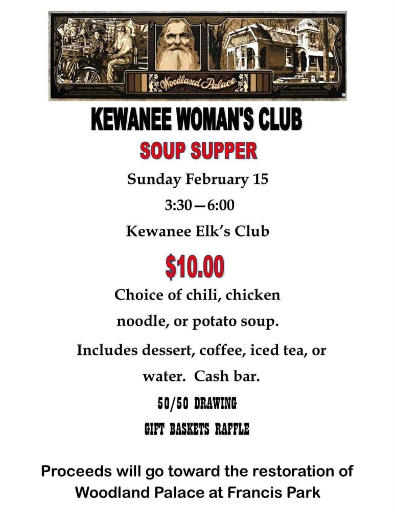 The Kewanee Woman’s Club is inviting the community to a soup supper at the Kewanee Elk’s Club on February 15th from 3:30 to 6 PM. For just $10, attendees will have their choice of chili, chicken noodle, or potato soup, along with dessert and drinks. All proceeds from the evening will benefit the ongoing restoration of Woodland Palace at Francis Park, a historic local landmark. Organizers encourage residents to come out, enjoy a warm meal, and support a cherished piece of Kewanee history. There will be a 50/50 drawing and raffle baskets. Every bowl served helps preserve the past for future generations.