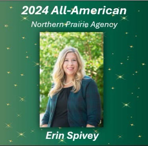 Erin Spivey said, “I am very honored to have received All American my first full-year as an agent in 2024. Thank you to all of my clients and staff helping to reach this milestone. It is an honor to be able to bring peace of mind and financial security to people in the community.”