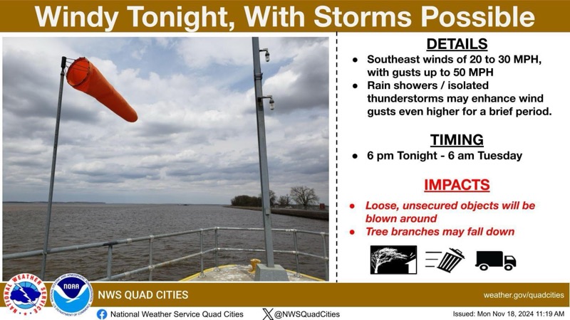 The National Weather Service said strong winds are expected to increase after 6 PM tonight, November 18, 2024, into Tuesday morning. Southeast winds over 20 mph and wind gusts up to 50 mph are possible tonight. Showers and isolated thunderstorms are possible tonight and may contain higher wind gusts at times. Small tree branches may fall and loose objects may blow around with the wind gusts.