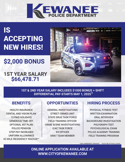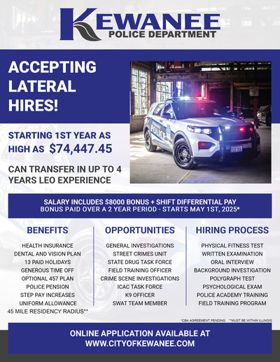 Exciting Career Opportunities with Competitive Salaries and Benefits with The Kewanee Police Department