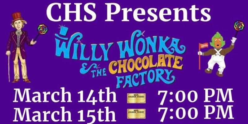 Cambridge High School will present Willy Wonka and the Chocolate Factory on March 14th and March 15th. The performances begin at 7:00 PM. Audience members are invited to experience the magical world of Willy Wonka as students bring this classic tale to life.