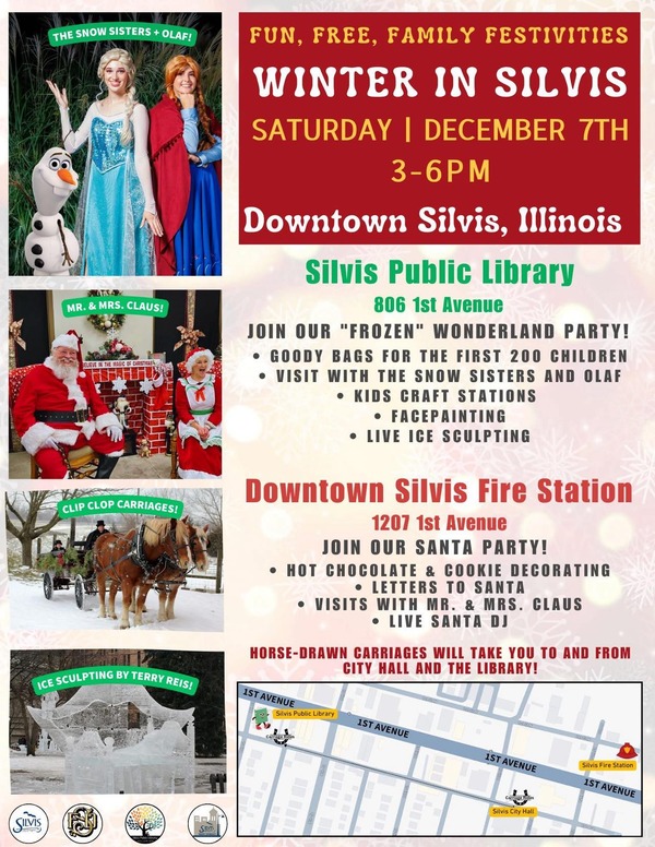 Downtown Silvis will become a winter wonderland on Saturday during the ‘Winter in Silvis’ event on December 7th from 3 PM to 6 PM. The festivities, free for all families, will feature visits from the Snow Sisters and Olaf, live ice sculpture, and kids’ craft stations. There are goodie bags for the first 200 children at the Frozen Wonderland party. To top off the festive events, there will be a Santa-themed party that will offer hot chocolate, cookie decorating, and a chance to meet Mr. and Mrs. Claus. Horsedrawn carriages will provide transportation between key venues, including the Silvis Public Library and City Hall.