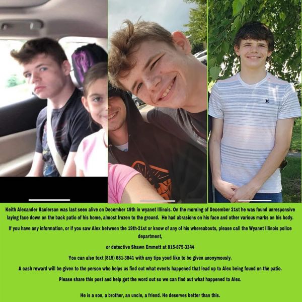 Denise Raulerson is asking for help from the public regarding the death of her 18-year-old son, Keith Alexander Raulerson, on December 22, 2024, in Wyanet. His Aunt reached out to RegionalMediaNews, asking us to inform the public and ask people to contact the Wyanet Police Department with any information regarding Keith’s death. Keith was last seen alive on December 19th in Wyanet, according to his family. He was found on December 21st unresponsive on the back patio of his home, “almost frozen to the ground.” The Facebook post from his mother said he had abrasions on his face and other marks on his body. Keith was transported to an area hospital on Saturday, where he later died on Sunday. Investigator Emmett said they have received some calls from the KWQC Article. As of now, this is an active death investigation, and no additional information is available at this time.