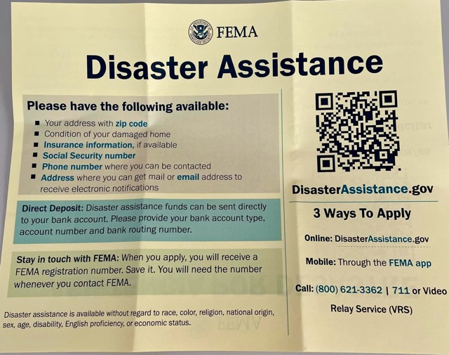 DSA teams will never ask for or accept money and will always be wearing a FEMA identification badge with a photograph. A FEMA shirt, vest, or jacket is not proof of identity. While helping someone apply, they will ask for personal information, including social security numbers, annual income, and bank information. Residents are encouraged to ask for identification before providing any personal information. They can also call the FEMA Helpline at 800-621-3362 to verify a FEMA visit is legitimate.