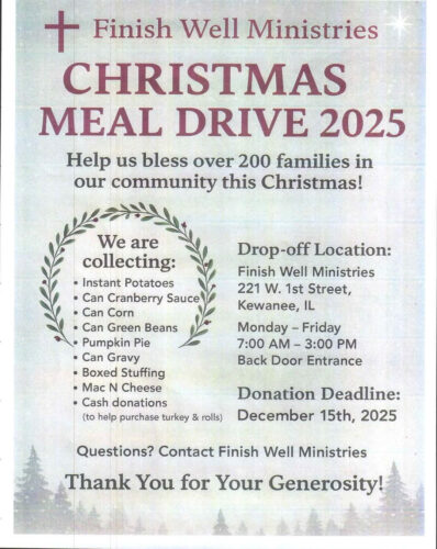 Finish Well Ministries has launched a Christmas Meal Drive to benefit more than 200 families in Kewanee. Organizers are requesting donations of non-perishable food or cash, which can be delivered to 221 West First Street, between 7 AM and 3 PM, to the back door. Community members have until December 15th to contribute to ensure all families in need enjoy a holiday meal. Organizers say every donation, big or small, will make a difference. Volunteers are already preparing boxes to distribute as the deadline approaches. For those interested in making a positive impact this season, there’s still time to help support neighbors and spread holiday cheer. For more information or questions, contact Finish Well Ministries by phone at 309-696-2679 or by email at [email protected].