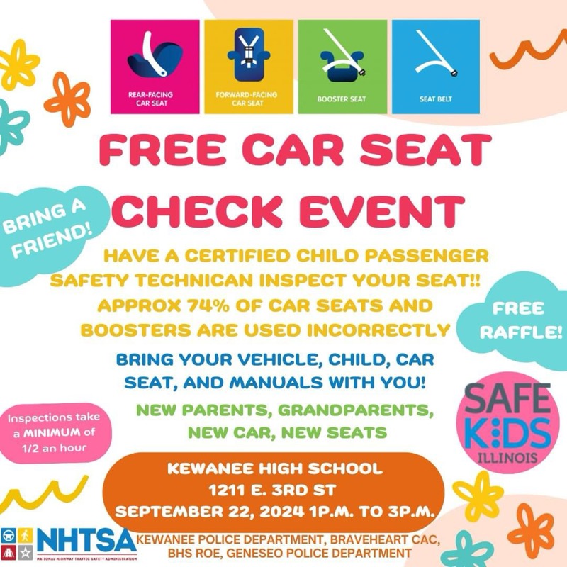 The Kewanee Police Department, Braveheart Children’s Advocacy Center, and Parents as Teachers have teamed up to offer a FREE car seat safety check on Sunday, September 22, 2024, at the Kewanee High School parking lot. This is the group’s first annual National Child Passenger Safety Week event. The Kewanee Police Department has two certified child passenger safety technicians, and the Braveheart CAC has one. The event is free to the public, and no appointments are required.  The event is from 1 to 3 PM. All you need to do is bring your vehicle, child, car seat, and car seat manual to get checked for proper fit and installation based on your child’s weight and age. Technicians will also check your vehicle and car seat for recalls and ensure your car seat is registered to receive recall notifications.  Officer Josh Carpenter will be there with juice boxes and snacks from Operation Juice Box for children while waiting, and there will be take-home crafts from Parents as Teachers. Bilingual services are available.  They ask for your help to reach their goal of 30 car seat checks or more! Car seat checks take approximately 30 minutes.