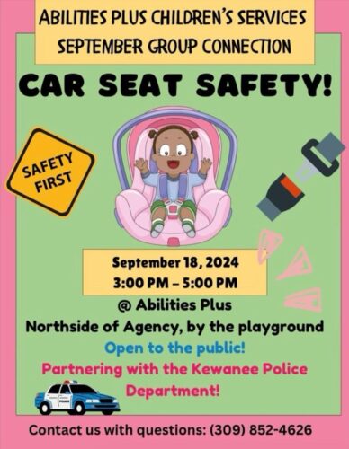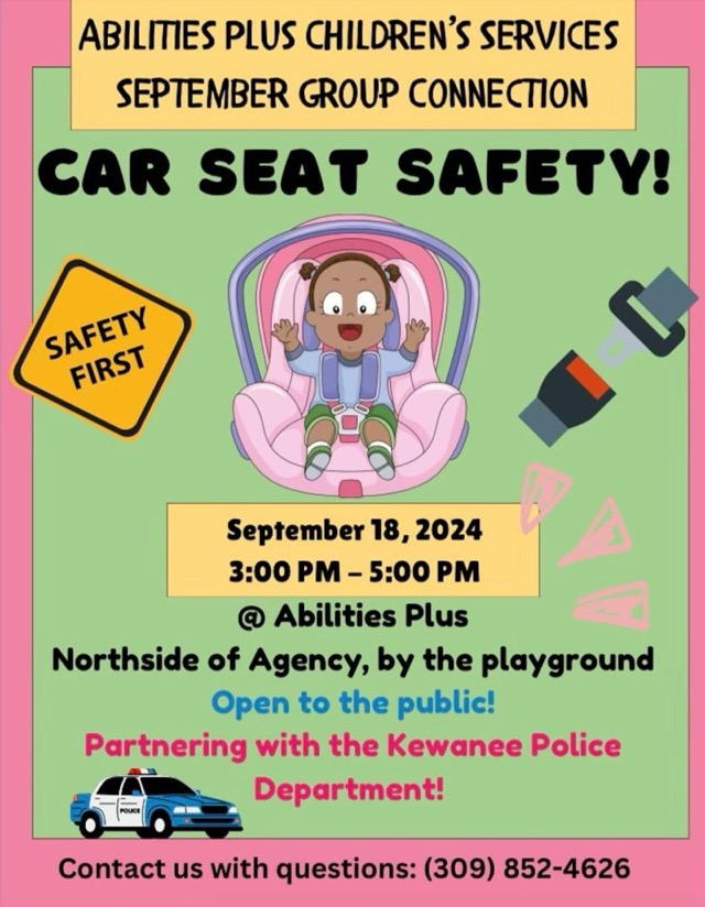Abilities Plus and The Kewanee Police Department are holding a Car Seat Safety education on Wednesday, September 18, 2024, from 3 to 5 PM. The event will be held on the north side of the building by the playground. The event is open to the public. Call 309-852-4626 with any questions.