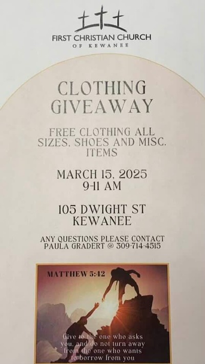Matthew 5:42 Ministries is set to host a community clothing giveaway at First Christian Church in Kewanee. Scheduled for March 15, 2025, from 9 to 11 AM, this event promises free clothing in all sizes, as well as shoes and various miscellaneous items for those in need. Taking place at 105 Dwight Street, it’s an opportunity for community members to support one another and access essential items. Those interested or with questions can reach out to Paula Gradert at 309-714-4515. This initiative reflects the church’s commitment to helping those in need, fostering a spirit of community support and care.