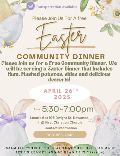 Free Easter Dinner Celebration at First Christian Church in Kewanee on April 26th