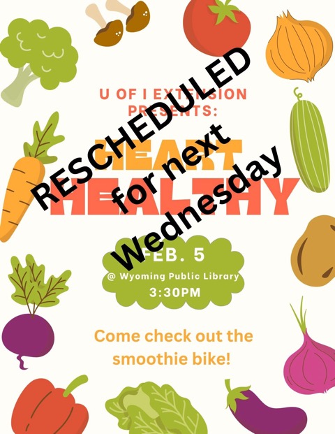 Mark your calendars for next Wednesday, February 12th, as the University of Illinois Extension Heart Healthy event moves to the Wyoming Public Library, located at 119 N. 7th Street, Wyoming, Illinois. Starting at 3:30 PM, attendees can look forward to a unique experience with the smoothie bike, blending fun and fitness in one go. Originally planned for February 5th, the event was postponed due to inclement weather. Don’t miss out on this interactive opportunity—same time, same enthusiasm, just a new date. The library is ready to welcome everyone for an afternoon of creativity and health. Be there to pedal your way to a delicious treat!