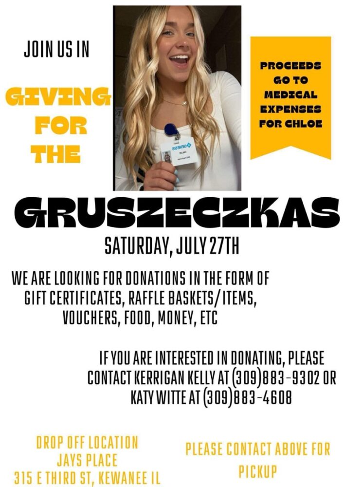 There are still opportunities to help Chloe Gruszeczka and her family with medical bills, time off work, and travel costs. You can donate to GoFundMe here. Save the date for July 27, 2024, for a fundraiser to help pay Chloe’s medical bills. The event is at Jay’s Place, located at 315 E. 3rd Street in Kewanee, and we will give an update closer to July 27th with time for the fundraiser. In the meantime, fundraiser organizers are looking for donations such as gift certificates, raffle basket items, vouchers, food, money, etc.