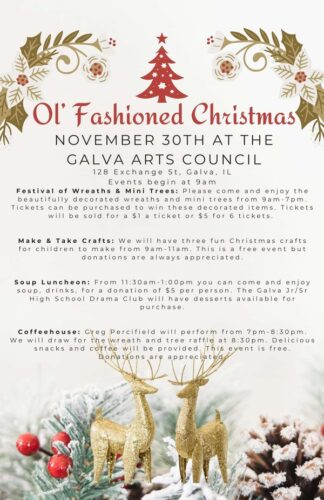 The Galva Chamber of Commerce is set to host the Ol’ Fashioned Christmas event on November 30th at the Galva Arts Council, located at 128 Exchange Street. The festivities start at 9 AM with a Festival of Wreaths & Mini Trees, craft sessions for children, a soup luncheon, and a live performance by Greg Percifield. Tickets for the wreath and mini tree raffle are available for purchase. Attendees are encouraged to make donations at these events. The Galva Girl Scouts Troop is holding a toy drive in Veterans Park from 1 to 4 PM. Carriage rides are available from 1 to 4 PM in Veterans Park.  See the full schedule below.