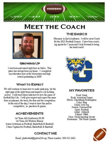 Galva High School proudly welcomes Zach Anderson as the new head varsity football coach for the 2025 season. A celebrated Galva native, Anderson brings a rich tapestry of seven years of coaching experience and a deep-seated passion for the sport. He aims to instill a love for the game in his players, stressing the importance of respect and competitiveness both on the practice field and during games. Anderson, a four-year letterman and two-time captain, cherishes his roots and looks forward to contributing to the community as he takes the helm of the Galva Wildcats varsity 8-man football team this fall. As a Galva School alumnus, Anderson’s impressive history as a four-year letterman in multiple sports and a decorated athlete speaks volumes. He was a two-time captain in football and basketball, earning First-Team All-Conference honors. Returning to his hometown, Anderson aims to inspire players on the field, bringing his hometown hero legacy back to life. Stay tuned for more as the Galva Tigers take to the field with renewed vigor.