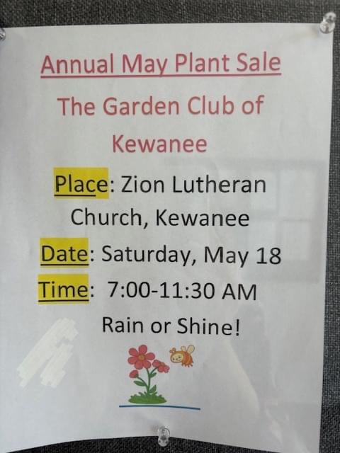 The Garden Club of Kewanee is holding its annual May plant sale on Saturday, May 18, 2024, at Zion Lutheran Church in Kewanee. From 7 to 11:30 AM, rain or shine, you can purchase various plants and be ready for the summer season.