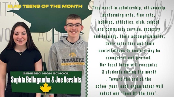 Geneseo High School has announced Sophia Bellagamba and Joe Versluis as Teens of the Month for March for their achievements in scholarship, citizenship, performing arts, athletics, and community service. Nominated by staff, these students demonstrate outstanding contributions across various fields, setting a commendable example for their peers. Congratulations to Sophia and Joe for their remarkable achievements and contributions to their community.