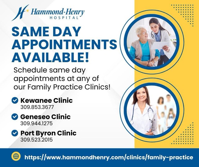 Hammond-Henry Hospital announces the availability of same-day appointments at their Family Practice Clinics. Interested individuals can schedule visits at Kewanee Clinic, Geneseo Clinic, and Port Byron Clinic. For more information, visit their website or call the clinics directly.